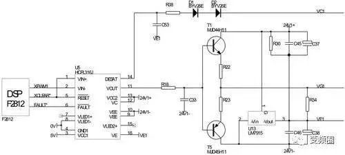 整个电路板的作用相当于一个光耦隔离放大电路。它的核心部分是芯片HCPL-316J,其中由控制器(DSP-TMS320F2812)产生XPWM1及XCLEAR*信号输出给HCPL-316J,同时HCPL-316J产生的IGBT故障信号FAULT*给控制器。同时在芯片的输出端接了由NPN和PNP组成的推挽式输出电路,目的是为了提高输出电流能力,匹配IGBT驱动要求。
