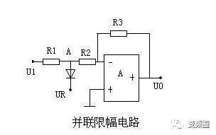 限幅器是一个具有非线性电压传输特性的运放电路。其特点是:当输入信号电压在某一范围时,电路处于线性放大状态,具有恒定的放大倍数,而超出此范围,进入非线性区,放大倍数接近于零或很低。在变频器电路设计中要求也是很高的,要做一个好的变频器维修技术员,了解它也相当重要。 1、 二极管并联限幅器电路图如下所示: